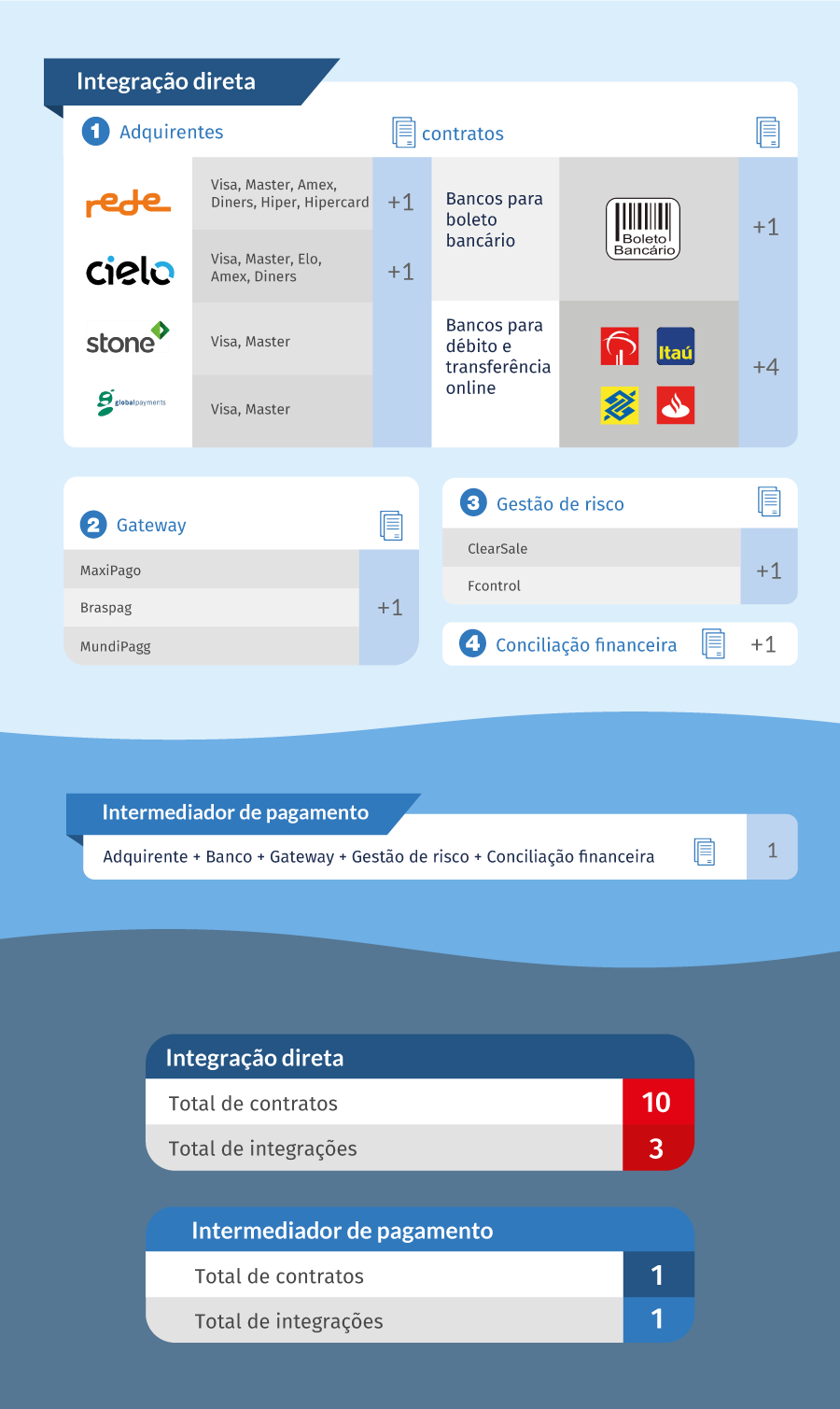 Essa conexão, no entanto, é feita de forma automática e independente do e-commerce. Na prática, isso quer dizer que o empreendedor precisa efetuar contratos junto às instituições financeiras, além de assumir todos os riscos relativos às transações efetuadas.